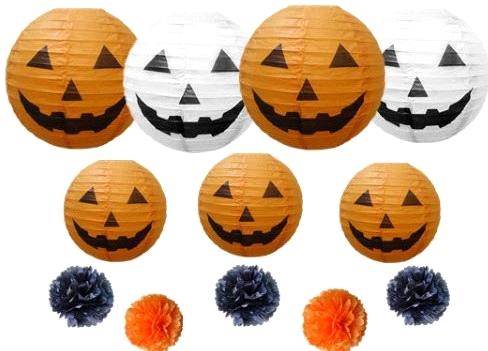 Create a scary atomosphere, incorporating, Orange and Black Hanging lanterns, with skeletons, witches, ghosts and creepy cobwebs, sweet pumkins, carved with frightening faces and barrels of red and green apples, color is the key..